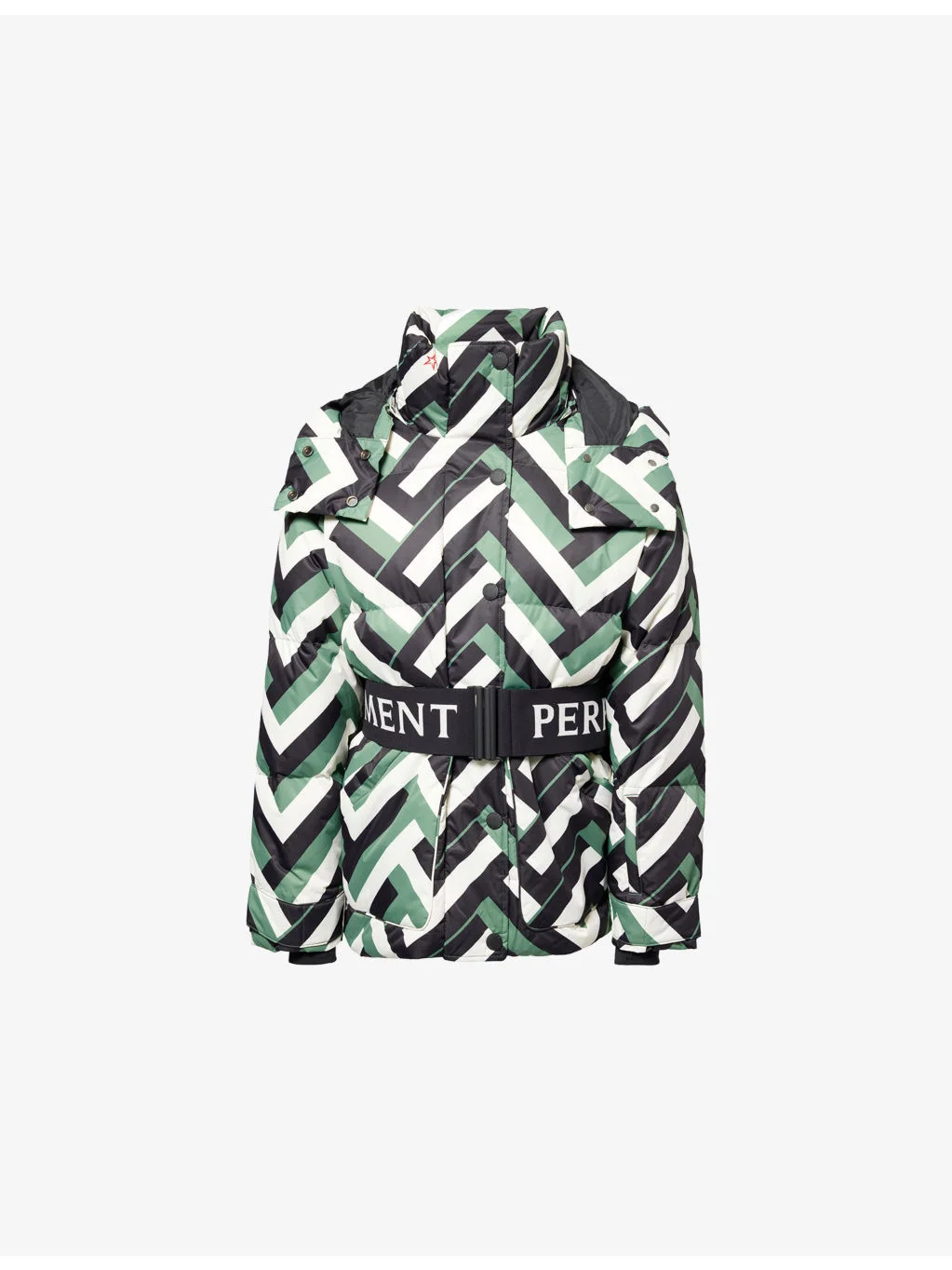 PRODUCT DETAILS - Perfect Moment shell-down ski jacket - 100% polyethylene; filling 80% duck down, 20% feathers; lining 100% polyester - Exposed pressed stud and concealed zip fastening at front - Relaxed fit, high neck, detachable helmet-compatible hood, long sleeves, touch-strap cuffs, elasticated cuffs with thumb holes, exterior ski pass pocket, interior chest pocket, interior goggle pocket with cloth cleaner, reversible branded self-closing belt, two front diagonal zip pockets, adjustable snow skirt, all-over waffle print, water-resistant, 700-fill-power Allied down, RECCO® technology, thigh length, fully lined - Machine wash at 30°C - True to size - Size small: length 24in / 60cm - Model is 5ft 10in/1.78m and wears a size small - Midweight, non-stretch Ref: R04526945
