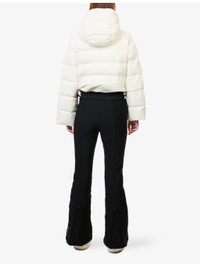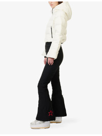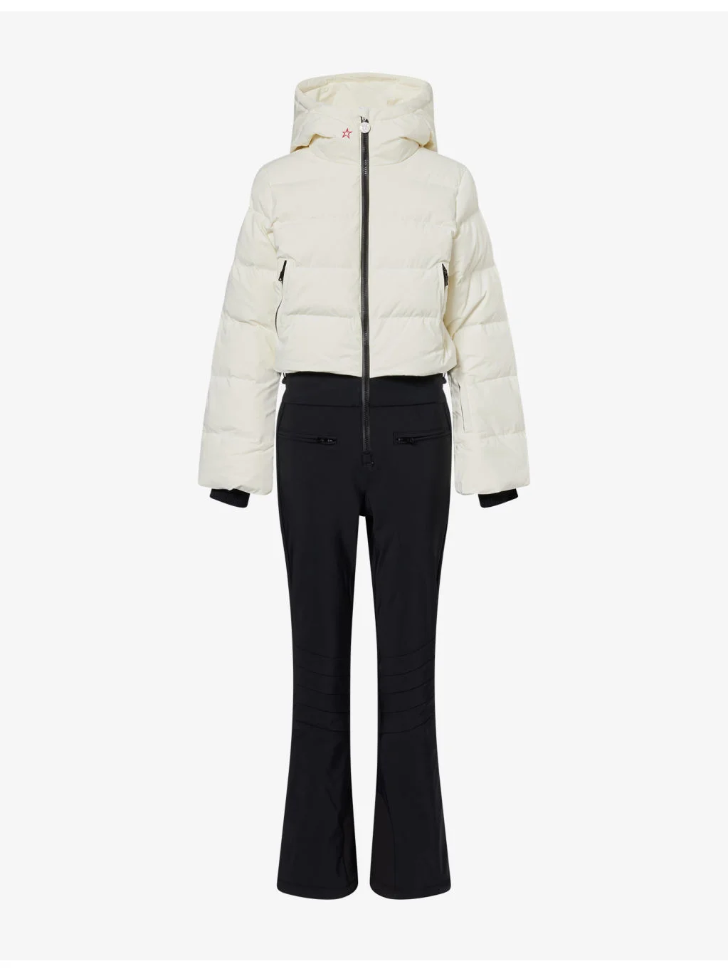 PRODUCT DETAILS - Perfect Moment down ski suit - 83% nylon, 17% elastane; contrast 80% nylon, 20% elastane; filling 80% duck down, 20% feathers; lining 100% polyester - Concealed zip fastening at front - Flared silhouette, helmet-compatible hood, flared leg, star logo embroidered at front, four front zip pockets, one exterior ski pass pocket, drawcord waist, adjustable zipper at hem, branded zipper, boot-friendly hems, snow gaiters with interior silicone elastic, anti-tear guards, water-repellent, Toray Dermizax™ fabric, RECCO® technology, four-way stretch - Machine wash at 30°C - True to size - Size small: length 60in / 152cm, inside leg 30in / 76cm, leg opening 22in / 56cm - Model is 5ft 10in/1.78m and wears a size small - Heavyweight, non-stretch Ref: R04526947