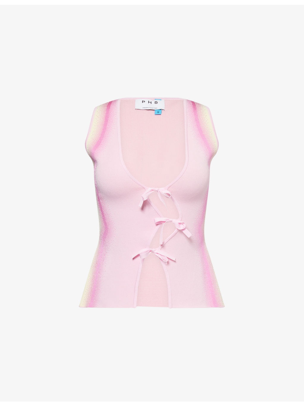 PRODUCT DETAILS - PH5 knitted vest - 71.3% viscose, 17.5% rayon, 9.4% polyester, 1.8% elastane - Self-tie fastening at front - Slim fit, V-neck, sleeveless, cinched waist, wavy fastening at front, all-over abstract print, all-over knitted - Machine wash cold - True to size - Size small: length 21in / 53cm - Model is 5ft 10in/1.78m and wears a size small - Midweight, stretchy Ref: R04483333
