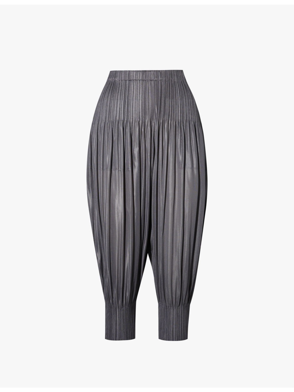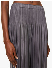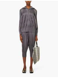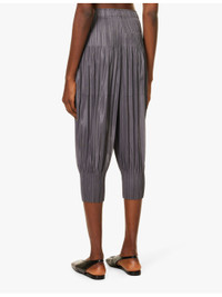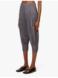 PRODUCT DETAILS - Pleats Please Issey Miyake knitted trousers - 100% polyester - Slips on - Regular fit, mid-rise, tapered cropped leg, elasticated waistband, all-over textured pleats - Machine wash cold - Made in Japan - Size 2: rise 14in / 36cm, inside leg 21in / 53cm, leg opening 10in / 26cm - Model is 5ft 10in/1.78m and wears a size 2 - Lightweight, slight stretch Ref: R04215920-S