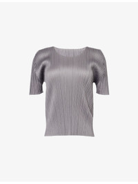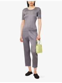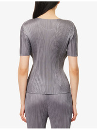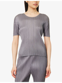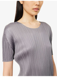 PRODUCT DETAILS - Pleats Please Issey Miyake knitted top - 100% polyester - Slim fit, round neck, short sleeves, all-over pleated design - Machine wash at 30°C - Made in Japan - Model is 5ft 10in/1.78m and wears a size UK 6 - Lightweight, slight stretch - This garment’s sizing is based on height and doesn’t conform to standard sizes. Please refer to the size guide for your desired length. Ref: R04462876