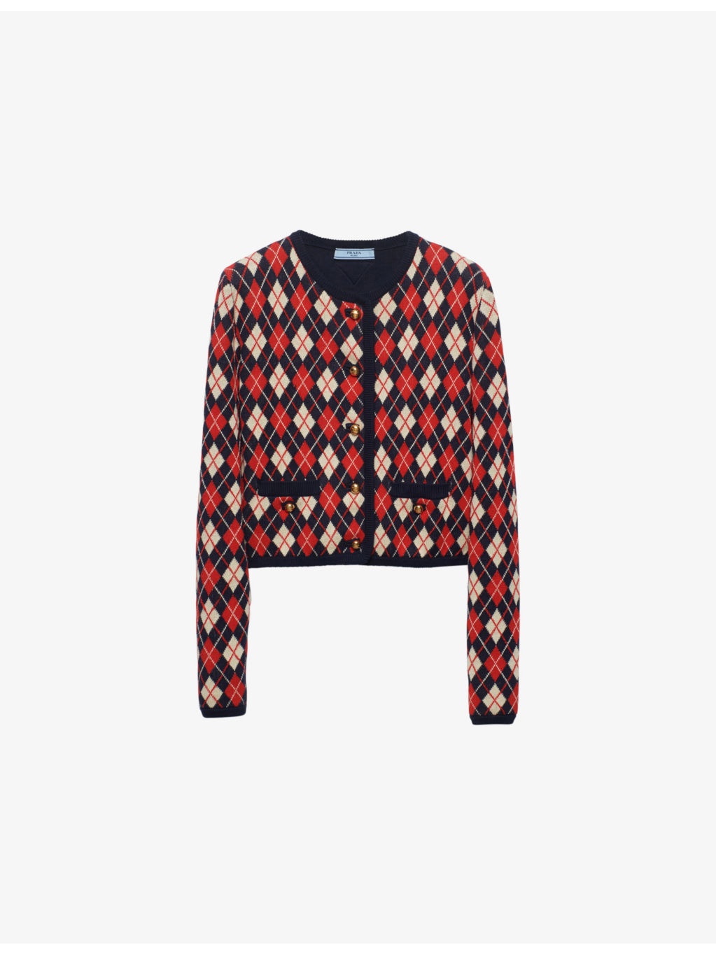 PRODUCT DETAILS - Prada cotton cardigan - 100% cotton - Exposed button fastening at front - Relaxed fit, round neck, long sleeves, all-over argyle intarsia pattern, two buttoned pockets at the side, gold-tone hardware - Dry clean - True to size - Model is 5ft 10in/1.78m and wears a size UK 8 - Midweight, non-stretch Ref: R04335241