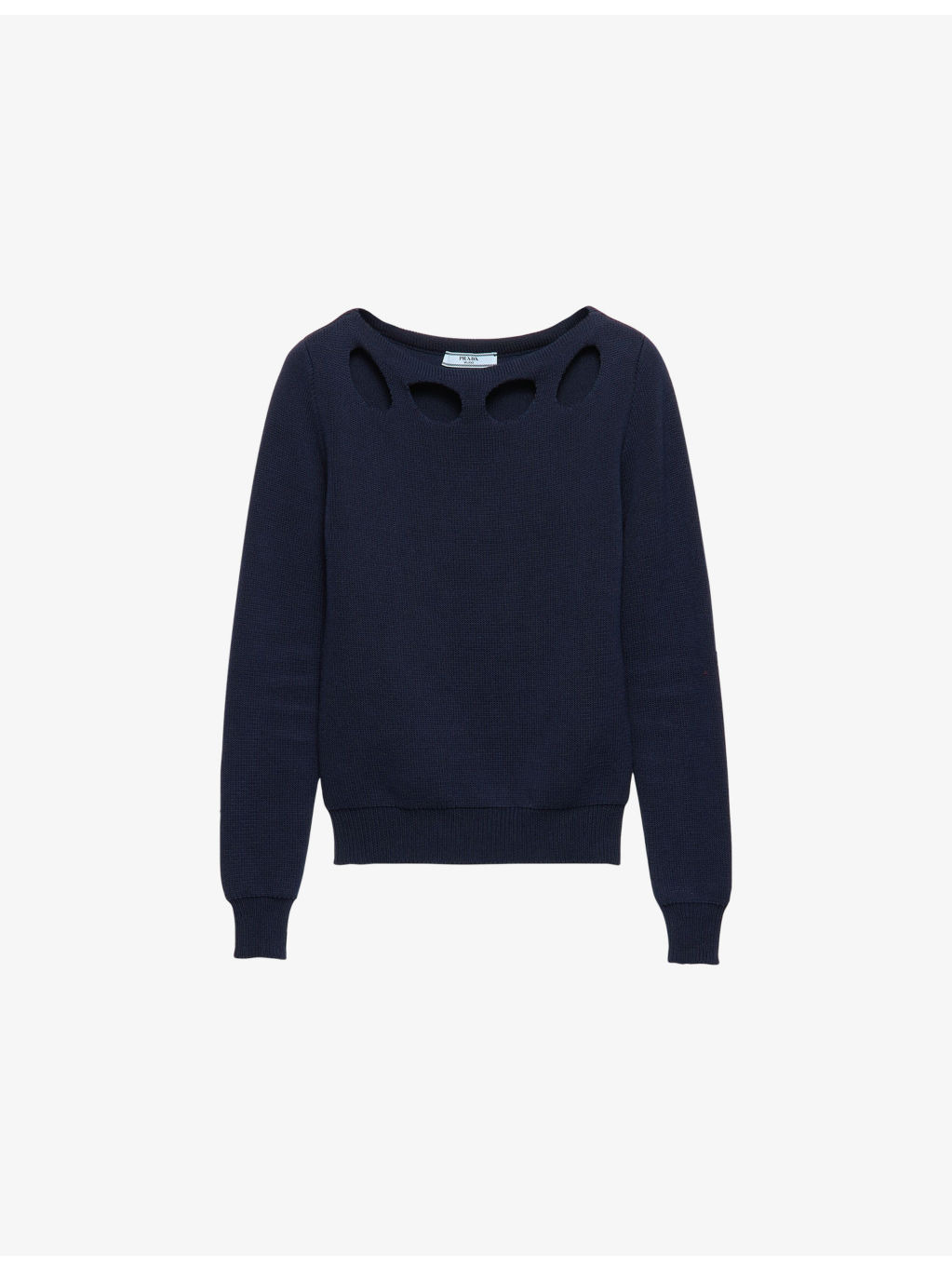 PRODUCT DETAILS - Prada cotton knitted jumper - 100% cotton - Regular fit, boat neck, cut-out at neckline, long sleeves, ribbed trims - Machine wash cold - Made in Italy - Model is 5ft 11in/1.80m and wears a size UK 8 - Midweight, slight stretch Ref: R04449923