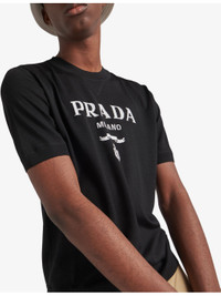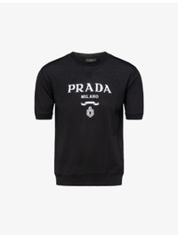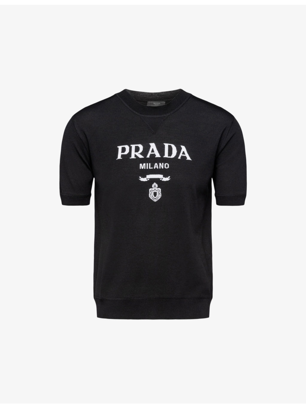 PRODUCT DETAILS - Prada wool jumper - 100% wool - Pulls on - Regular fit, ribbed crew neck, short sleeves, brand embroidery at front, all over knitted, ribbed elasticated hem - Dry clean - Made in Italy - Midweight, slight stretch Ref: R04268360