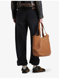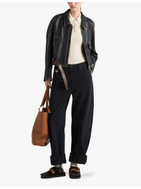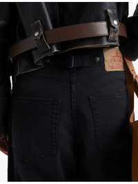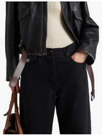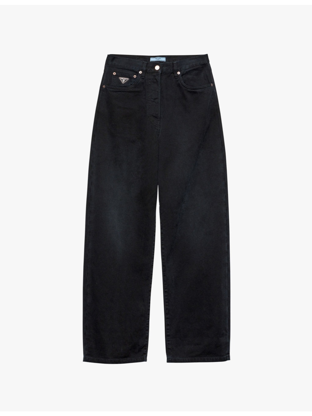 PRODUCT DETAILS - Prada denim jeans - 100% cotton - Exposed button and concealed button-fly fastenings to the front - Relaxed fit, low rise, belt loops, five pockets, enamelled metal triangle brand plaque to the coin pocket, barrel leg, garment dyed, washed treatment, buckled strap to the back waist, branded patch to the back - Hand wash cold - True to size - Midweight, non-stretch Ref: R04373138