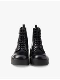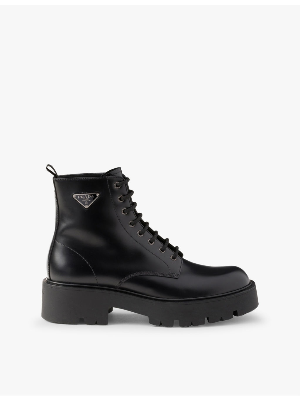 PRODUCT DETAILS - Prada leather combat boots - 100% leather - Lace-up fastening - Closed round toe, enamelled metal triangle brand plaque to the sides, gunmetal-toned hardware, flat laces, metal eyelets, all-over brushed finish, pull-loop to the back, chunky lug sole - Specialist leather clean - Made in Italy - Upper: 100% leather - Lining: 100% leather - Sole: 100% rubber Ref: R04373202