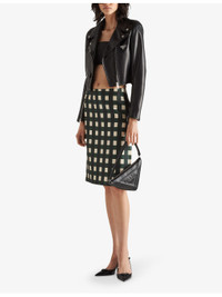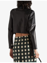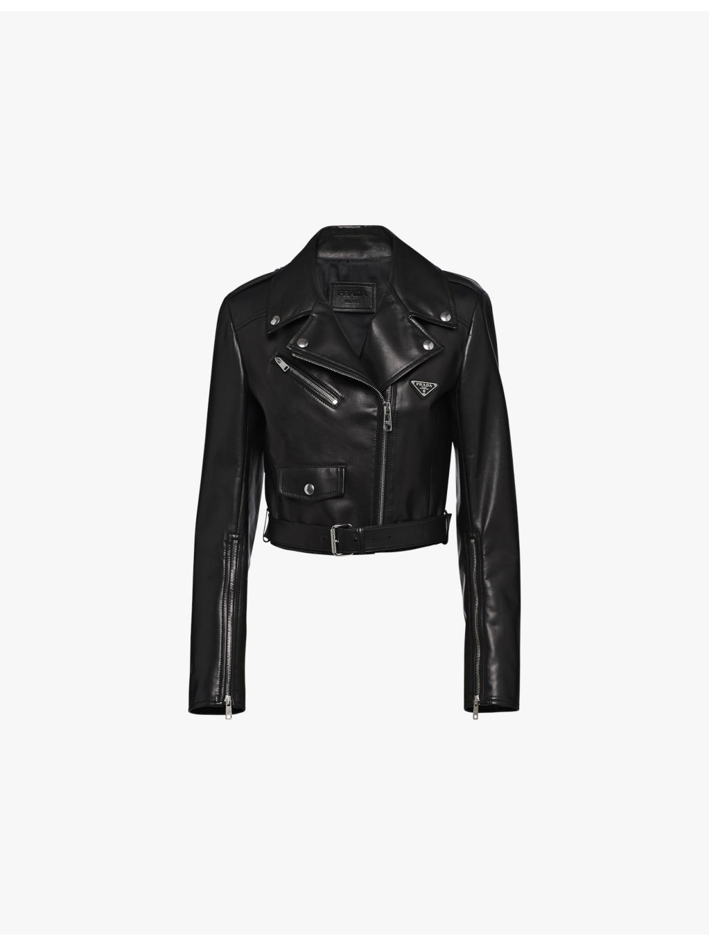 PRODUCT DETAILS - Prada leather biker jacket - 100% lambskin leather; lining 100% viscose - Exposed zip fastening to the front - Regular fit, biker collar, long sleeves, enamelled metal triangle brand plaque to the chest, silver-toned hardware, zipped pocket to the chest, flap pocket to the front, zipped cuffs, belted hem, cropped - Specialist dry clean only - Made in Italy - True to size - Midweight, non-stretch Ref: R04362491