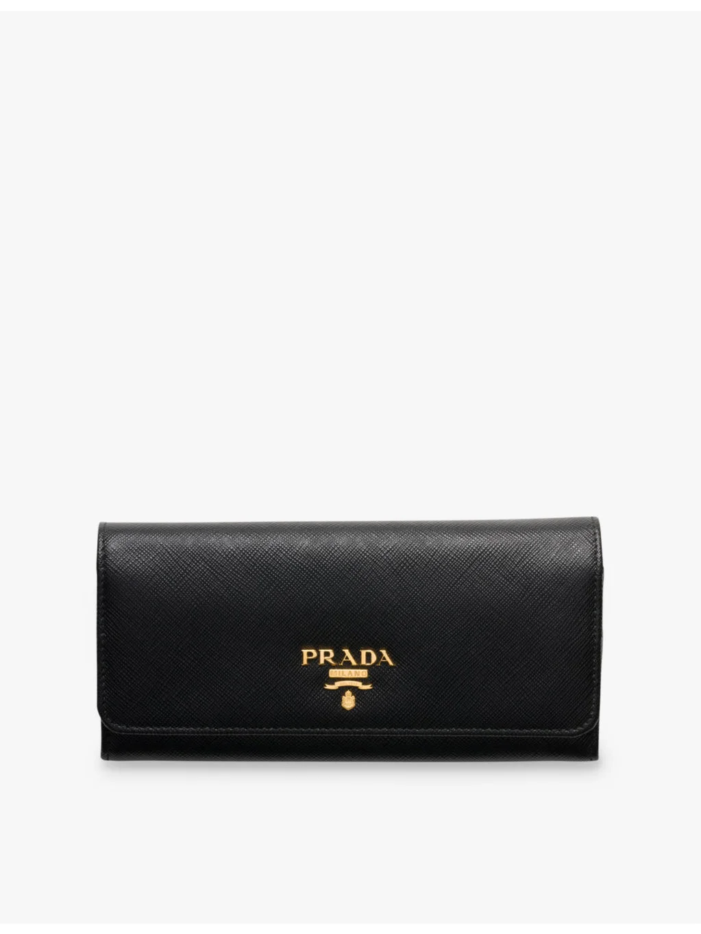 PRODUCT DETAILS - Prada leather wallet - 100% leather - Pressed stud fastening - Rectangle shape, metal brand plaque to the front, gold-toned hardware, all-over Saffiano crosshatch texture, two interior note compartments, ten card slots, four interior pockets, one interior zipped coin pocket, one exterior zipped pocket, leather lining - Dimensions: Height 9.5cm, width 18.7cm - Specialist leather clean - Made in Italy Ref: R04373224