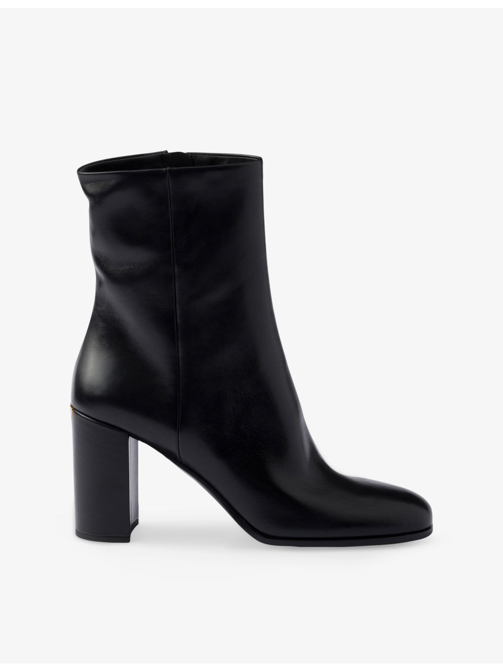 PRODUCT DETAILS - Prada leather heeled ankle boots - 100% leather - Zip fastening - Closed square toe, ankle length, enamelled metal triangle brand plaque at back of heel, stacked heel, gold-toned hardware - Heel height 3.34” - Specialist leather clean - Made in Italy - Upper: 100% leather - Lining: 100% leather - Sole: 100% leather; 100% rubber Ref: R04501428