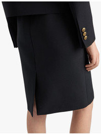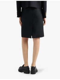 PRODUCT DETAILS - Prada wool mini skirt - 100% wool - Concealed zip fastening at side - Regular fit, mid waist, enamelled metal triangle brand plaque to the front hem, gold-toned hardware, pencil silhouette, lined, split to the back hem, mini length - Dry clean - Made in Italy - True to size - Midweight, non-stretch Ref: R04373215