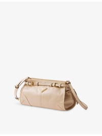 PRODUCT DETAILS - Prada leather shoulder bag - 100% leather - Zip fastening - Detachable, adjustable shoulder strap, shoulder pad to the strap, rectangular silhouette with buckled strap to the top, enamelled metal triangle brand plaque to the front, gold-toned hardware, one main interior compartment, interior central zipped pocket, interior patch pocket, leather and logo-print nylon lining - Height 14cm, width 26cm, length 12cm - Specialist leather clean - Made in Italy Ref: R04373125