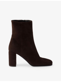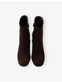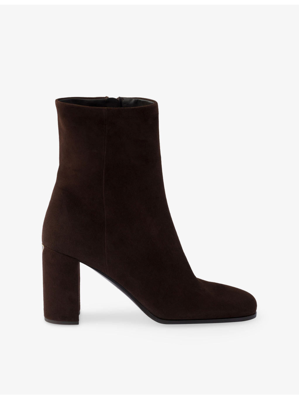 PRODUCT DETAILS - Prada suede heeled ankle boots - 100% suede - Zip fastening - Almond toe, brand plaque at heel, covered stacked heel - Heel height 3.3” - Specialist leather clean - Made in Italy - Upper: 100% suede - Lining: 100% leather - Sole: 100% leather; 100% rubber Ref: R04501423