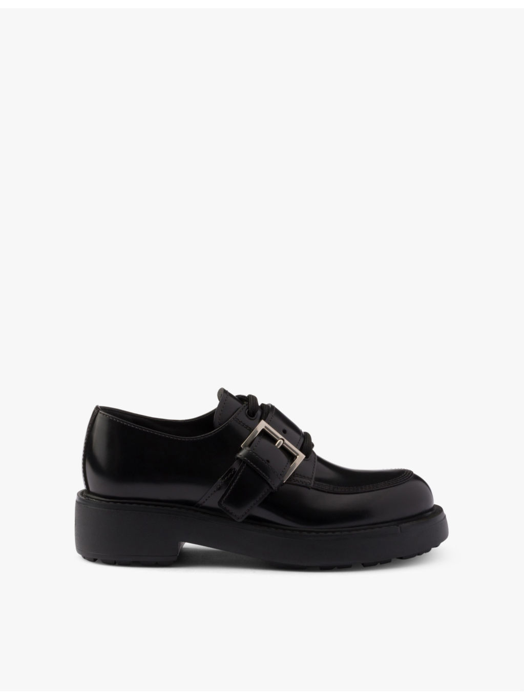 PRODUCT DETAILS - Prada leather loafers - 100% leather - Buckle fastening - Round toe, branded buckle, chunky sole, brushed finish - Specialist leather clean - Upper: 100% leather - Lining: 100% leather - Sole: 100% rubber Ref: R04359020
