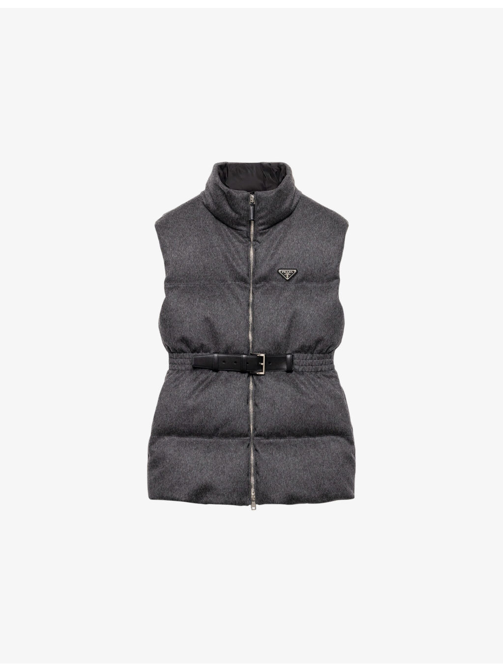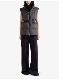PRODUCT DETAILS - Prada wool-down gilet - 100% wool; lining 100% down - Zip fastening - Regular fit, high-neck, sleeveless, belted waist, side pockets, branded triangle hardware, padded - Dry clean - True to size - Model is 5ft 11in/1.80m and wears a size UK 8 - Heavyweight, non-stretch Ref: R04518075