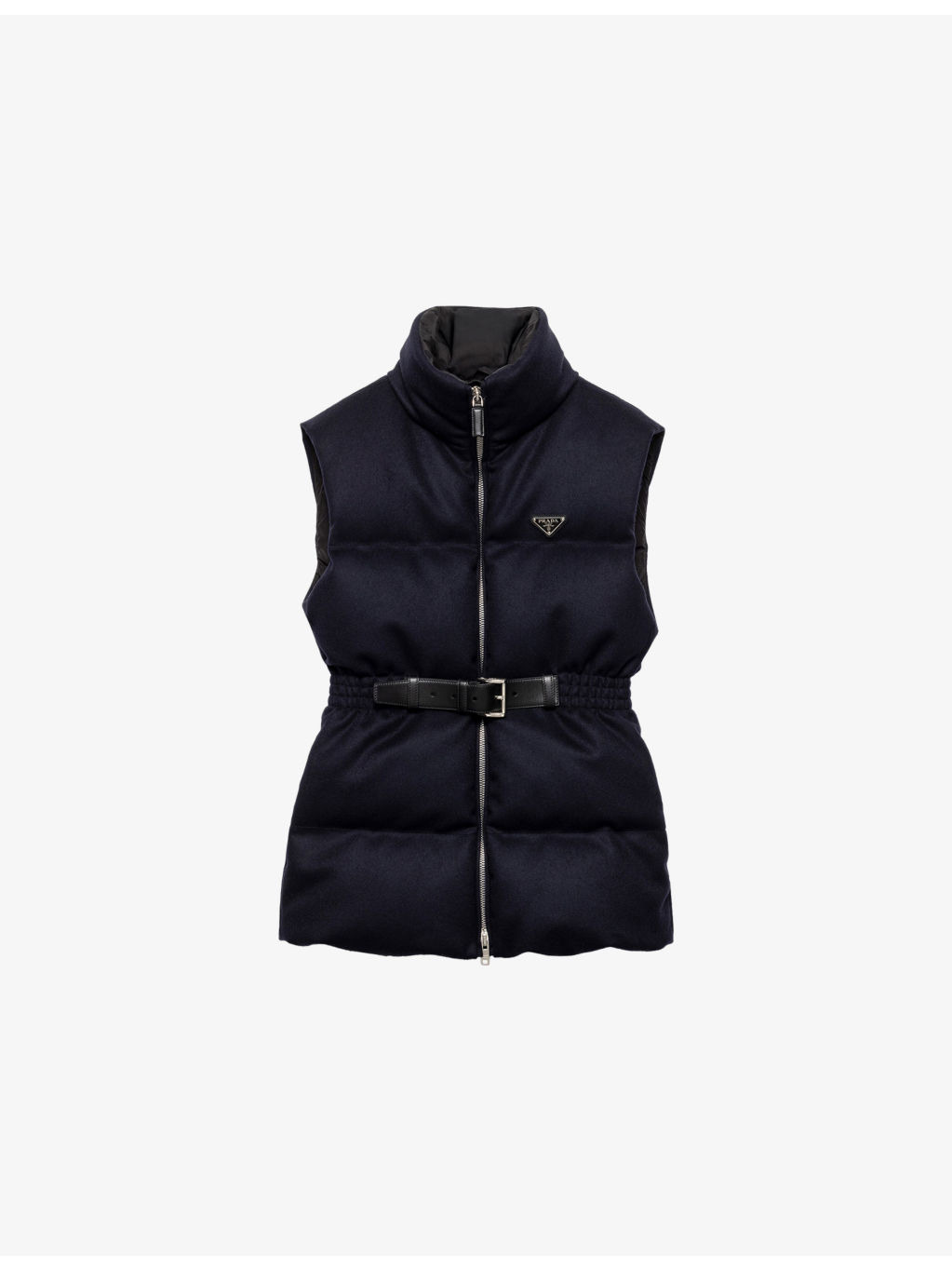 PRODUCT DETAILS - Prada wool-down gilet - 100% wool; lining 100% down - Zip fastening - Regular fit, high-neck, sleeveless, belted waist, side pockets, branded triangle hardware, padded - Dry clean - True to size - Model is 5ft 11in/1.80m and wears a size UK 8 - Heavyweight, non-stretch Ref: R04518075