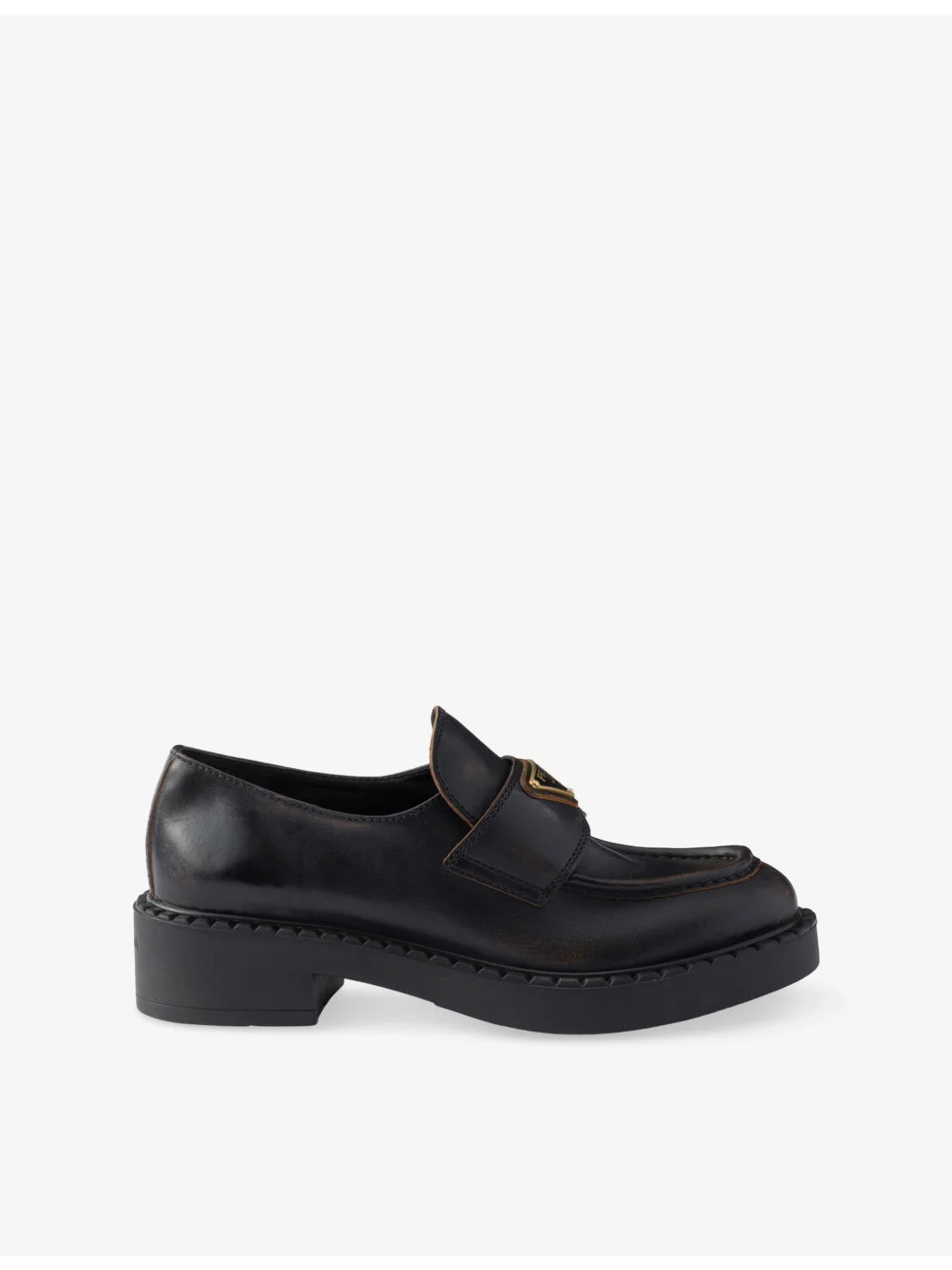 PRODUCT DETAILS - Prada leather loafers - 100% leather - Round toe, branded triangle hardware, chunky sole - Specialist leather clean - Upper: 100% leather - Lining: 100% leather - Sole: 100% rubber - Please note, we are unable to accept in-store returns on Prada orders Ref: R04569134