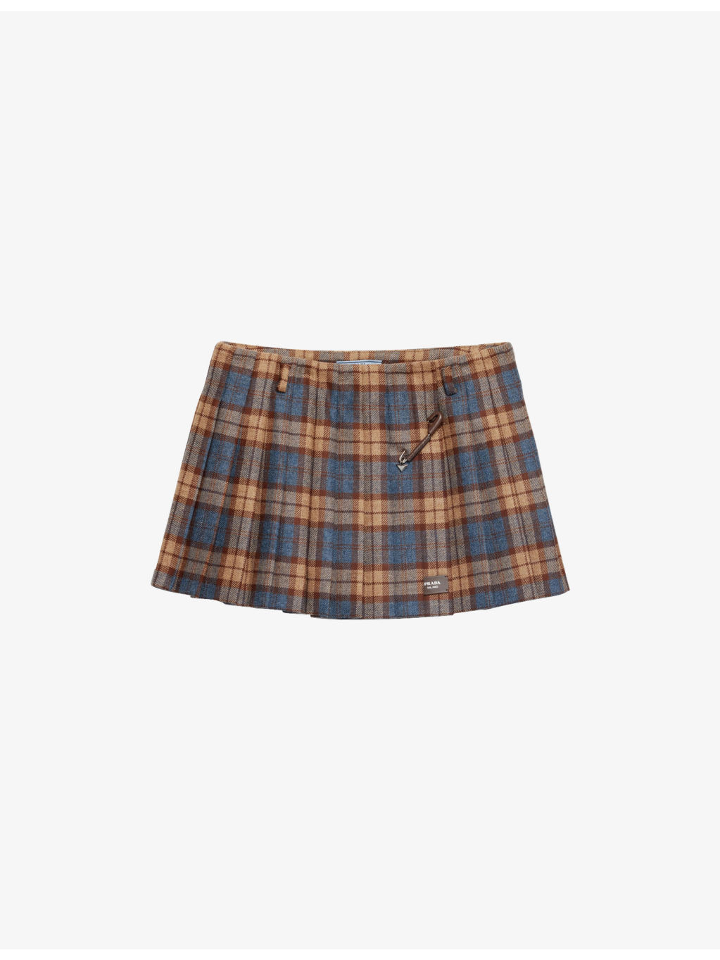 PRODUCT DETAILS - Prada wool mini skirt - 100% wool - Side hook and button closure - Regular fit, low rise, structured waistband with belt loops, safety-pin brooch, logo patch, check pattern, pleated design - Dry clean - Made in Italy - True to size - Model is 5ft 10in/1.78m and wears a size UK 8 - Lightweight, non-stretch Ref: R04494617