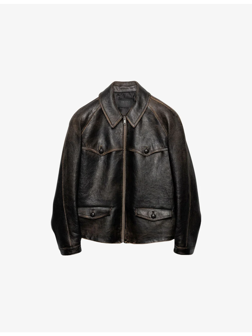 PRODUCT DETAILS - Prada leather jacket - 100% goatskin leather - Exposed zip fastening at front - Regular fit, collar, long raglan sleeves, four buttoned flap pockets, leather triangle branding at back, lined - Specialist leather clean - Made in Italy - True to size - Model is 5ft 11in/1.80m and wears a size UK 6 - Heavyweight, non-stretch Ref: R04569067