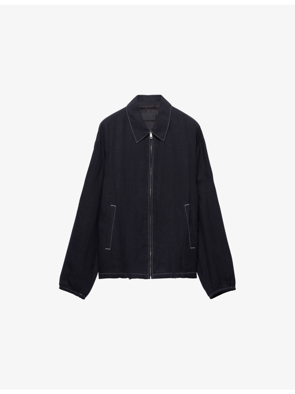 PRODUCT DETAILS - Prada cotton jacket - 100% cotton - Exposed zip fastening at front - Relaxed fit, shirt collar, dropped shoulders, long sleeves with elasticated cuffs, welt pockets at front, fabric triangle logo at back, straight hem with elastic drawstring, lined, contrast stitching around trim - Made in Italy - Model is 6ft 2in/1.88m and wears a size medium - Midweight, non-stretch - Please note, we are unable to accept in-store returns on Prada orders Ref: R04435851