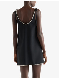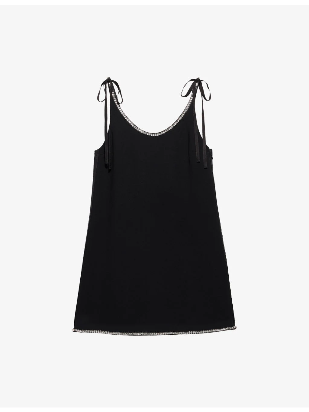 PRODUCT DETAILS - Prada woven mini dress - 70% acetate, 30% viscose - Concealed zip fastening at side - Regular fit, scoop neck, shoulder straps with ribbon bows, crystal-embellished trims, mini length - Dry clean only - Made in Italy - True to size - Model is 5ft 11in/1.80m and wears a size UK 6 - Lightweight, non-stretch Ref: R04570056