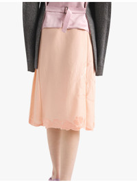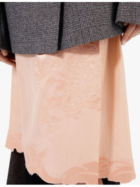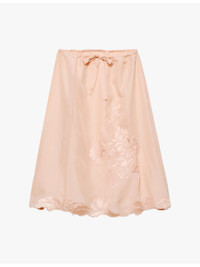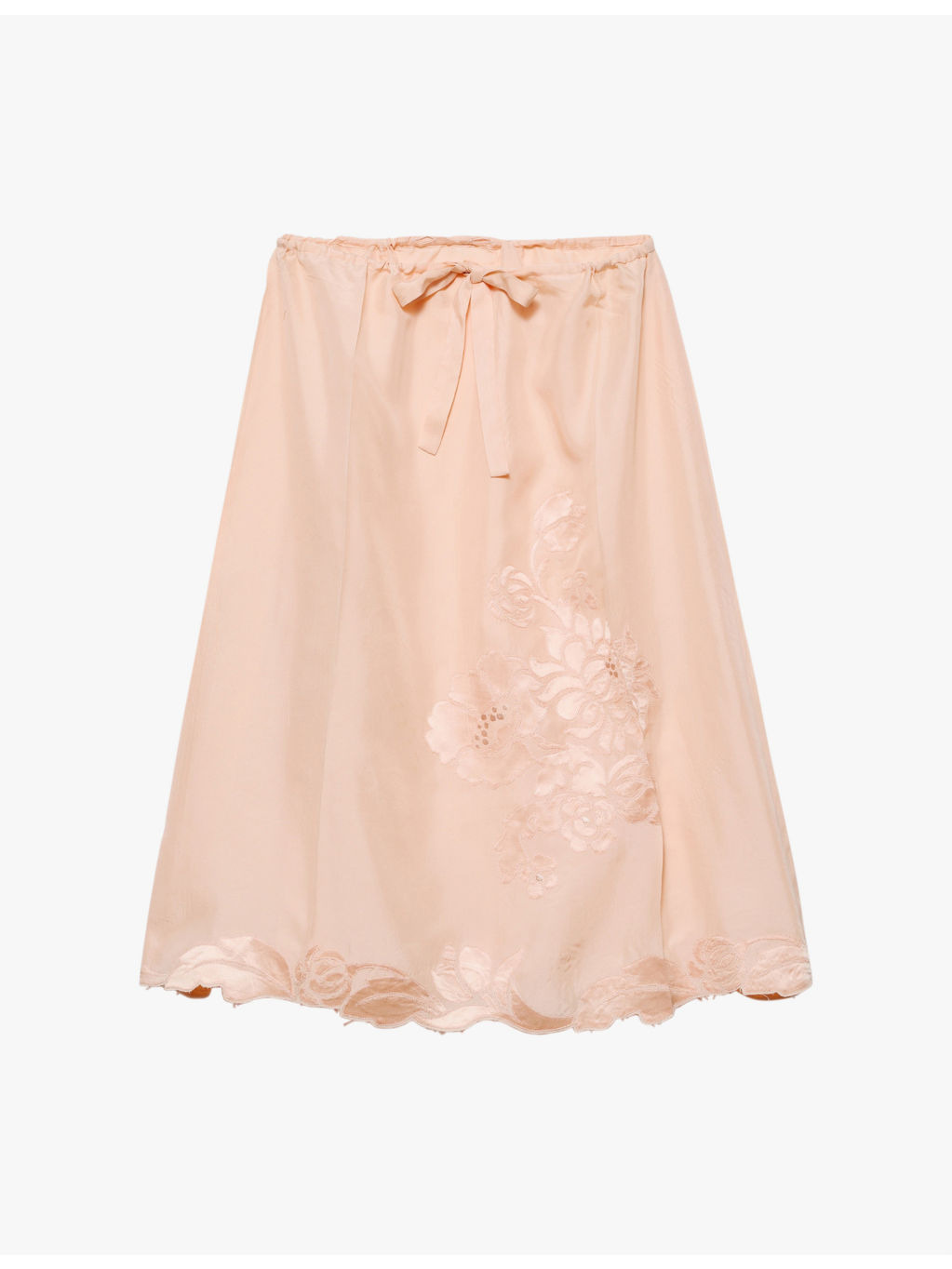 PRODUCT DETAILS - Prada silk midi skirt - 100% silk - Front drawstring closure - Regular fit, mid-rise, drawstring waist, embroidered design, flared hem, unlined - Dry clean only - Model is 5ft 10in/1.78m and wears a size UK 8 - Lightweight, non-stretch Ref: R04373175