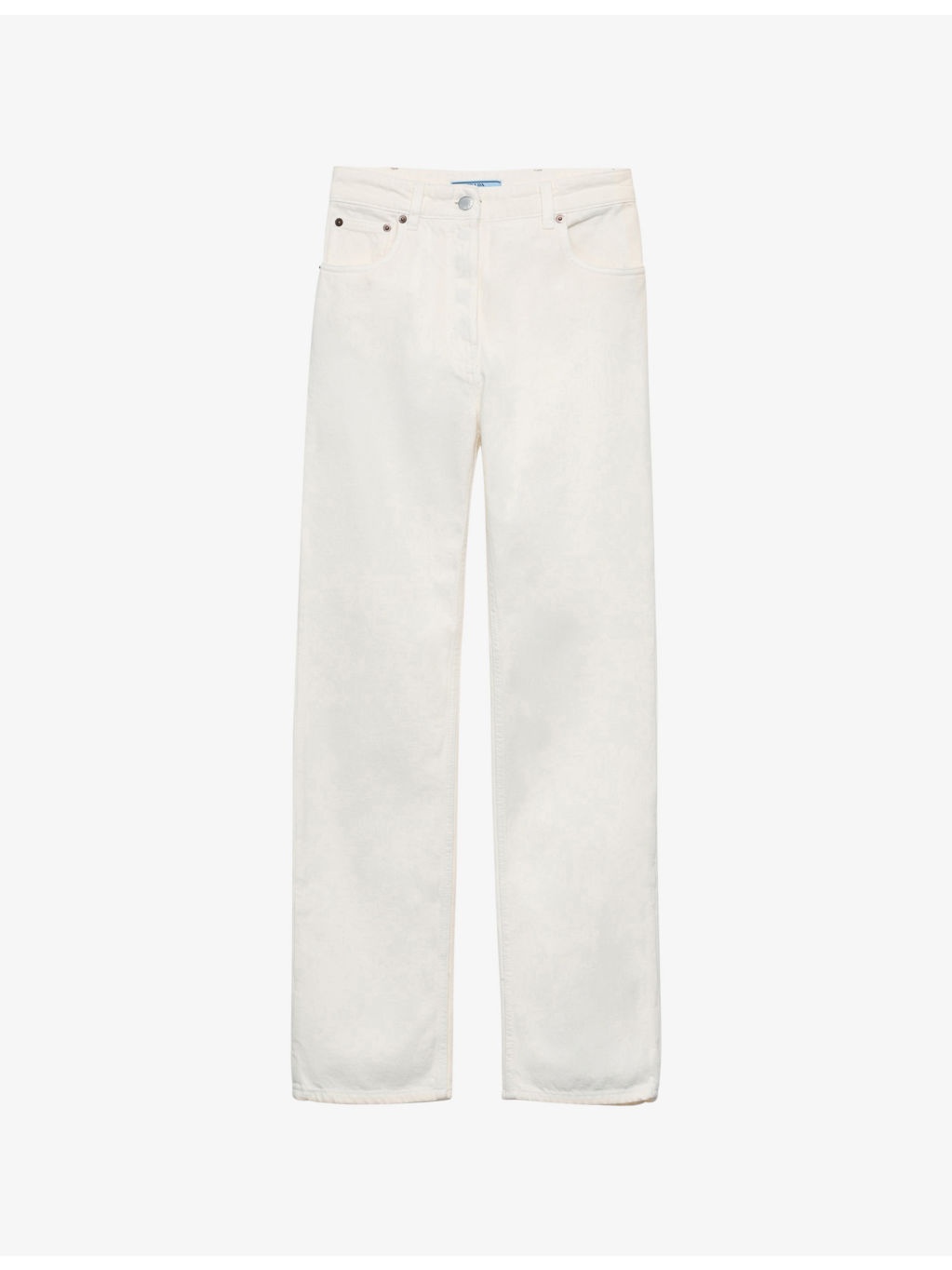 PRODUCT DETAILS - Prada denim jeans - 100% cotton - Button and button-fly fastening - Classic fit, high rise, straight leg, structured waistband with belt loops, five pockets, brand triangle patch at back, garment-dyed treatment, tonal stitching, branded hardware - Machine wash cold - True to size - Model is 5ft 11in/1.80m and wears a size UK 8 - Midweight, non-stretch Ref: R04422912