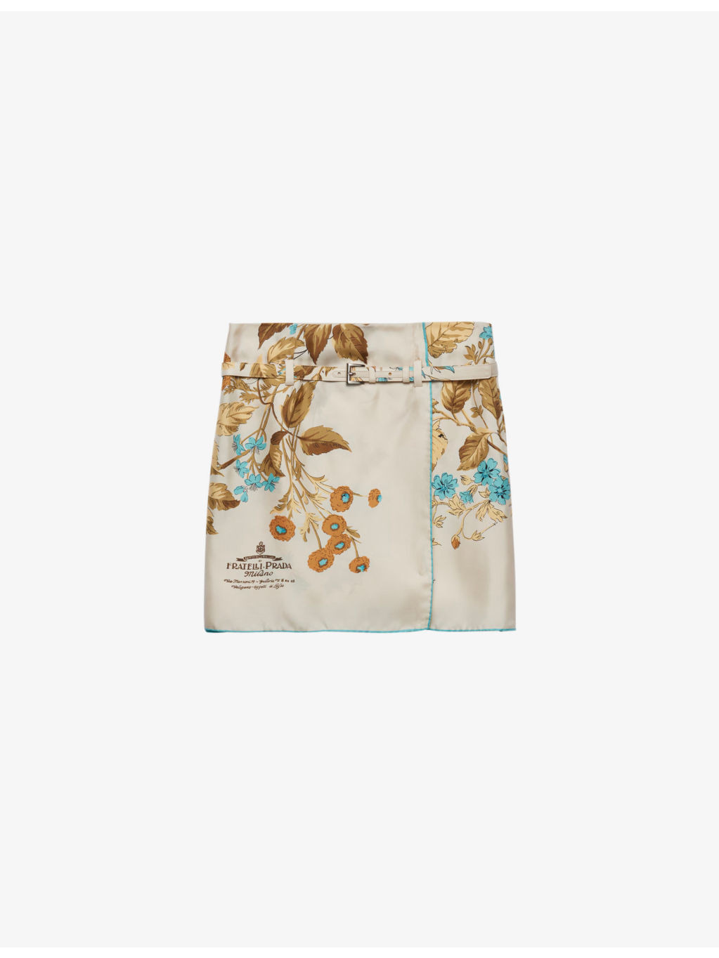 PRODUCT DETAILS - Prada silk-twill mini skirt - 100% silk - Concealed zip fastening at side - Straight, mid-rise, structured waistband, narrow fabric belt, all-over floral scarf print, archive logo - Dry clean - True to size - Model is 5ft 10in/1.78m and wears a size UK 8 - Midweight, non-stretch Ref: R04328404