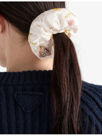PRODUCT DETAILS - Prada satin hair scrunchie - 100% satin - Floral print, enamelled metal triangle brand plaque to front, all-over quilted design, elasticated inner - Hand wash - Made in Italy - Lightweight, stretchy Ref: R04498569