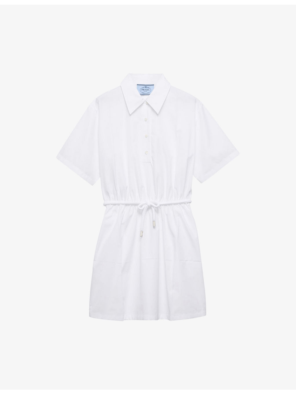 PRODUCT DETAILS - Prada cotton mini dress - 100% cotton - Exposed button fastening at front - Loose fit, classic shirt collar, short sleeves, draw-cord at waist, straight hem - Made in Italy - True to size - Model is 5ft 9in/1.75m and wears a size UK 8 - Lightweight, non-stretch - Please note, we are unable to accept in-store returns on Prada orders Ref: R04455282