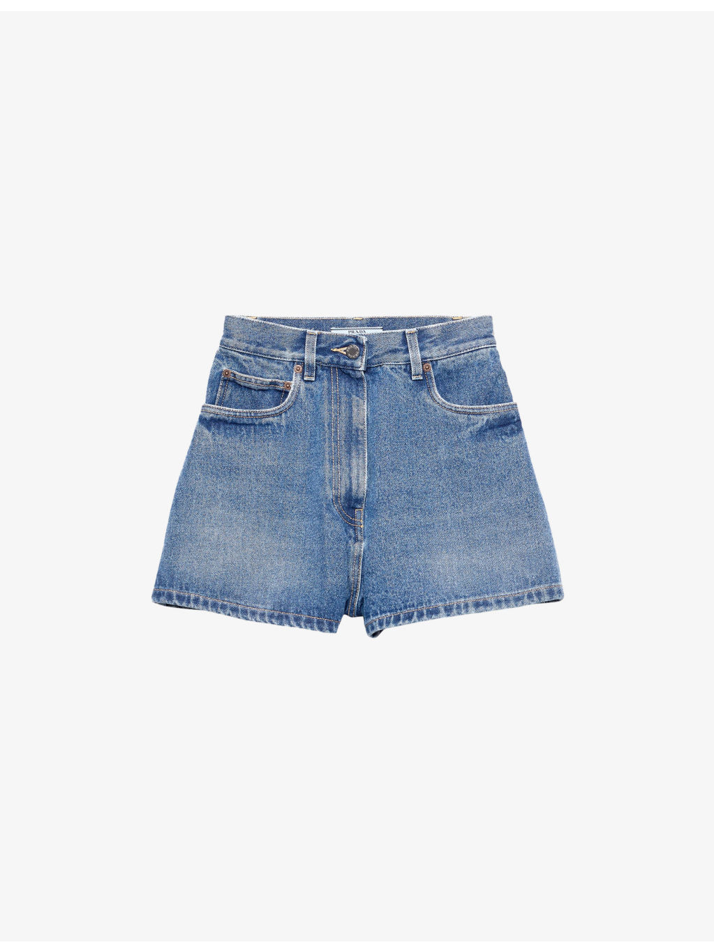 PRODUCT DETAILS - Prada denim shorts - 100% cotton - Button and zip-fly fastening - Regular fit, high-rise, belt loops, side pockets, back pockets, faded wash, triangle logo hardware - Dry clean - True to size - Model is 5ft 10in/1.78m and wears a size UK 8 - Midweight, non-stretch Ref: R04504191