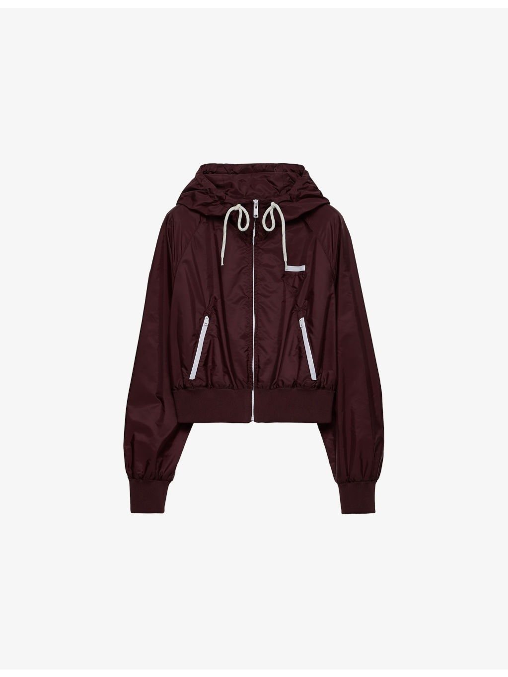 PRODUCT DETAILS - Prada woven jacket - 100% polyamide - Exposed zip fastening at front - Regular fit, drawstring hood, long sleeves, ribbed trims, two side zip pockets, triangle logo patch at chest, unlined - Dry clean - Made in Italy - True to size - Lightweight, slight stretch Ref: R04457901