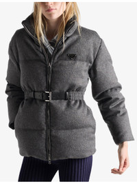PRODUCT DETAILS - Prada puffer jacket - 100% virgin wool - Exposed zip fastening at front - Relaxed fit, stand-up collar, long sleeves, enamelled metal triangle logo at chest, leather belt at front, elasticated waistband, two side slip pockets, one interior buttoned slip pocket, lined - Machine wash at 30°C - Made in Italy - True to size - Lightweight, non-stretch Ref: R04518072