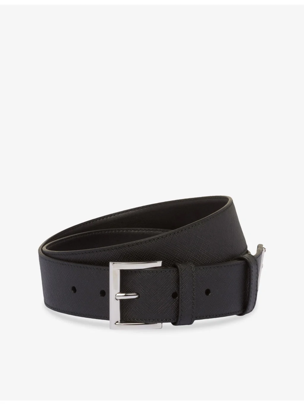 PRODUCT DETAILS - Prada leather belt - 100% leather - Buckle fastening - Square buckle, triangle shaped enamelled logo at tip, silver-tone hardware, all-over grained effect - Width: 3cm - Specialist leather clean - Made in Italy - Presented in a box Ref: R04268430