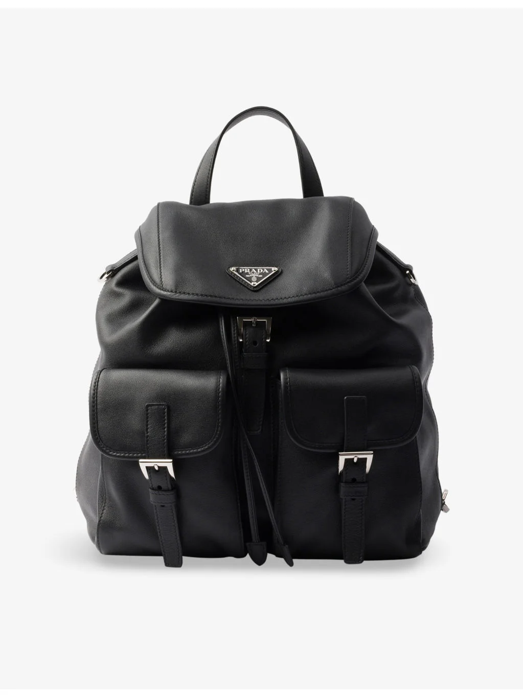 PRODUCT DETAILS - Prada leather backpack - 100% leather - Detachable, adjustable logo-print woven tape shoulder straps and leather handle, front flap pockets with strap and buckle closure, metal hardware, enameled metal triangle logo on the flap, drawstring, magnet and buckle closure, logo-print Re-Nylon lining, two pockets - Height 31cm, width 28cm, length 14cm - Please note, we are unable to accept in-store returns on Prada orders Ref: R04541533