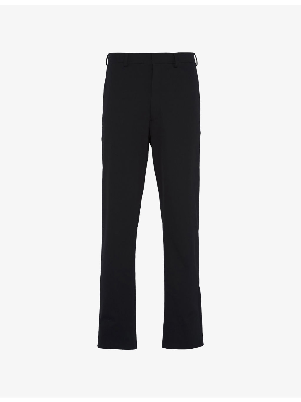 PRODUCT DETAILS - Prada stretch-woven trousers - 11% elastane, 89% polyester - Button and zip-fly fastening - Classic fit, zip fly with hidden hook, front slash pockets, back zip pockets, enamelled metal triangle logo on the back - Model is 6ft 2in/1.88m and wears a size UK 38 - Midweight, slight stretch - Please note, we are unable to accept in-store returns on Prada orders Ref: R04461378