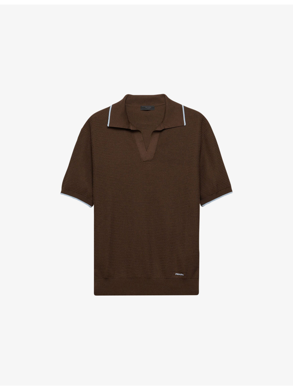 PRODUCT DETAILS - Prada silk and cotton polo shirt - 50% silk, 50% cotton - Regular fit, open collar, short sleeves, ribbed trims, logo embroidery, crochet-knit texture - Hand wash - True to size - Model is 6ft 2in/1.88m and wears a size UK 38 - Midweight, slight stretch Ref: R04442798