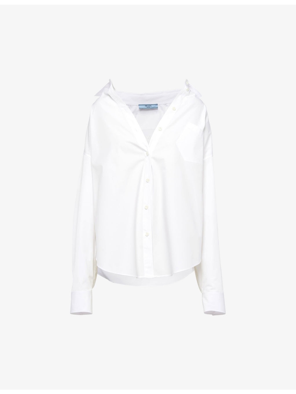 PRODUCT DETAILS - Prada cotton shirt - 100% cotton - Button fastening - Oversized fit, collared neckline, patch pocket at chest, logo embroidered at chest, long sleeves, buttoned cuffs - Dry clean - Made in Italy - True to size - Lightweight, slight stretch Ref: R04317301