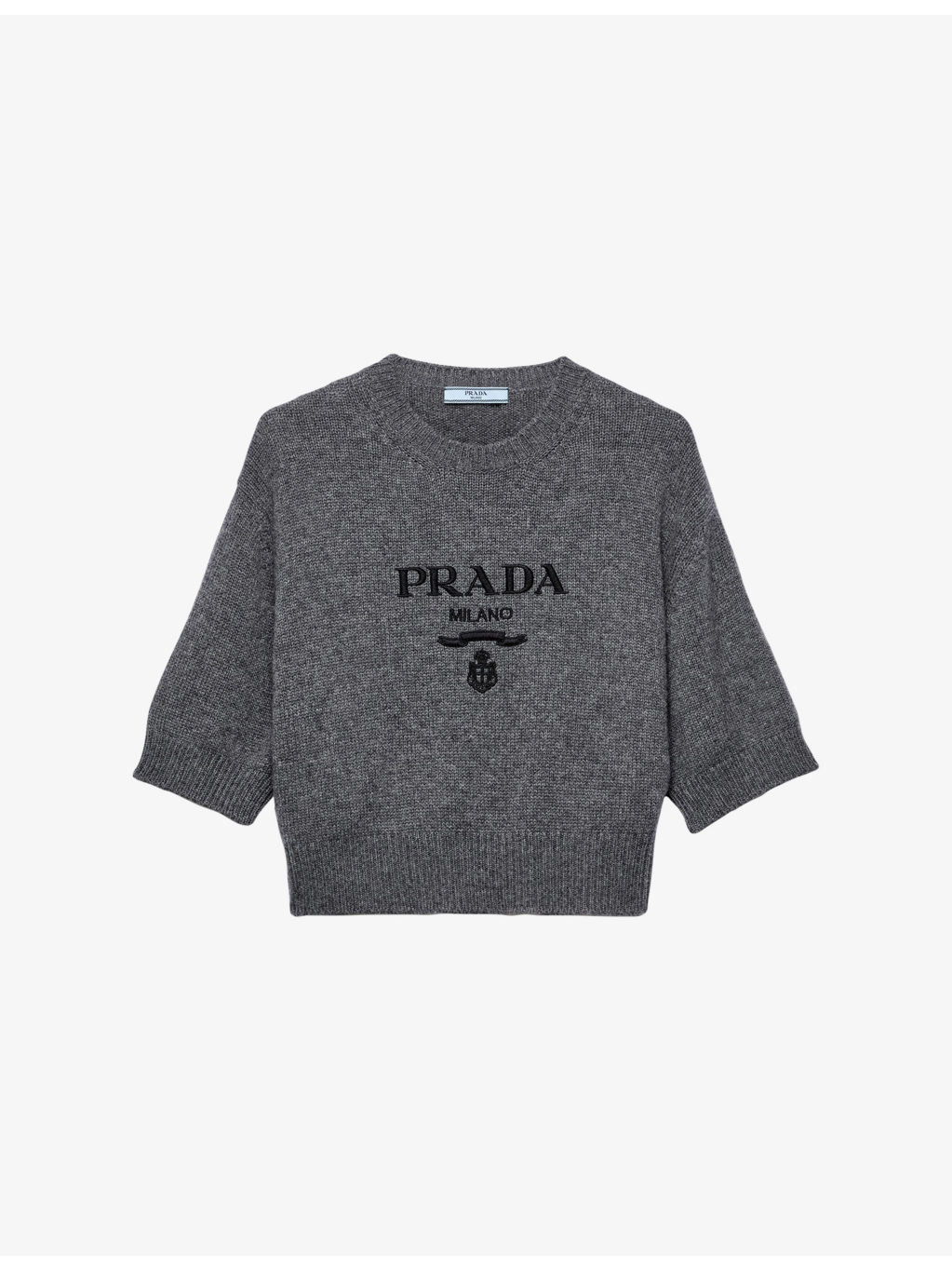 PRODUCT DETAILS - Prada cashmere-wool blend knitted jumper - 70% virgin wool, 30% cashmere - Regular fit, crew neck, short sleeves, logo embroidery at front, ribbed trims - Dry clean - Made in Italy - Model is 5ft 10in/1.78m and wears a size UK 8 - Midweight, slight stretch Ref: R04459094