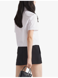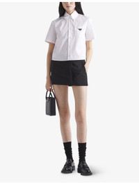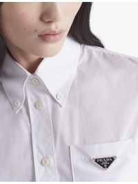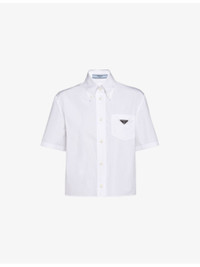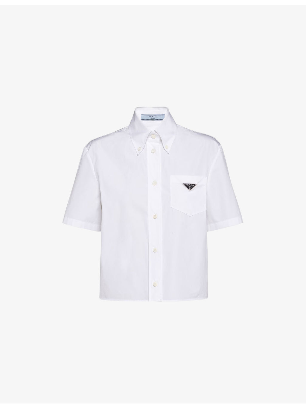 PRODUCT DETAILS - Prada cotton shirt - 100% cotton - Exposed button fastening at front - Regular fit, buttoned collar, short sleeves, triangle brand plaque at front, patch pocket, cropped hem, lined - Hand wash cold - True to size - Lightweight, non-stretch Ref: R04317125