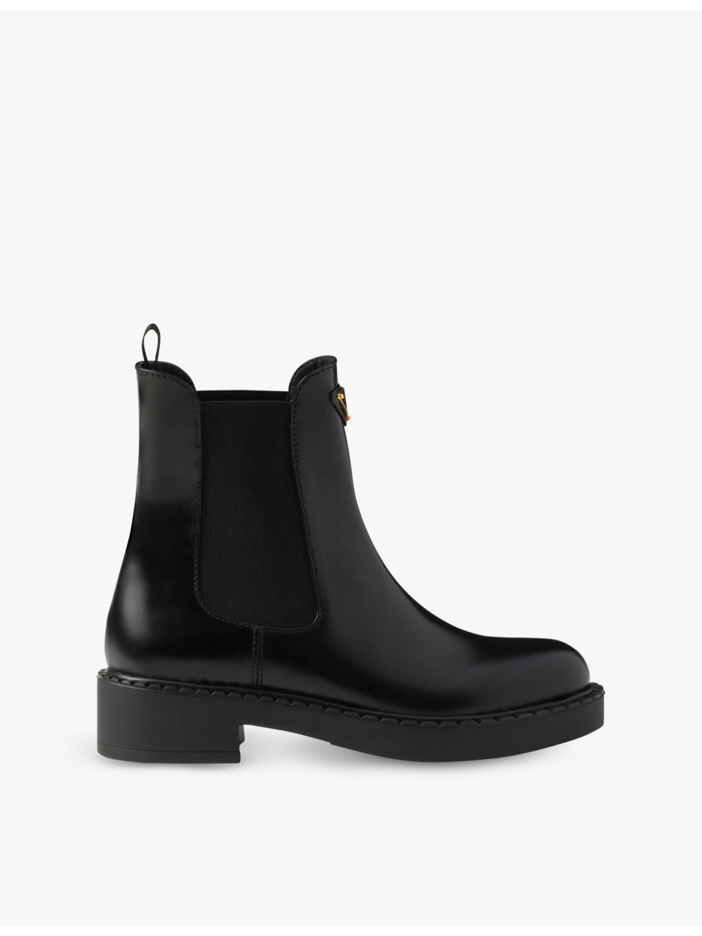 PRODUCT DETAILS - Prada leather Chelsea boots - 100% leather - Pulls on - Round closed toe, enameled metal triangle logo on front, elastic gusset, heel tab, chunky lugged sole and hot-stamped logo on sole - Heel height 1.9in - Made in Italy - Specialist leather clean - Upper: 100% leather - Lining: 100% leather - Sole: 100% rubber Ref: R04349240