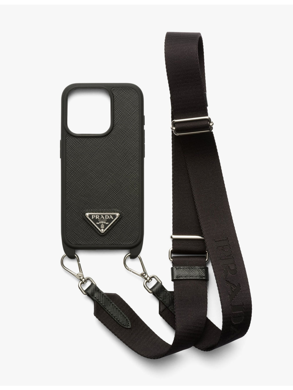 PRODUCT DETAILS - Prada leather iPhone 15 case - 100% leather - Slips on - Metal triangle logo, detachable, adjustable woven nylon neck strap, for iPhone 15 - Height 15cm, width 7cm - Wipe with a clean, dry cloth - Made in Italy Ref: R04334548