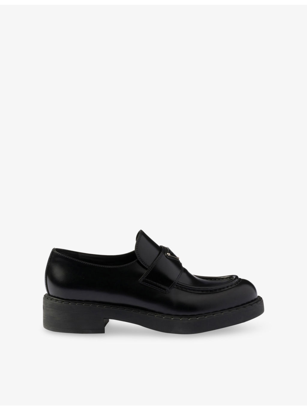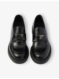 PRODUCT DETAILS - Prada leather loafers - 100% leather - Round toe, branded enamel plaque at tongue, tonal stitching, hot-stamped logo rubber sole - Specialist leather clean - Upper: 100% leather - Lining: 100% leather - Sole: 100% rubber - Please note, we are unable to accept in-store returns on Prada orders Ref: R04431214