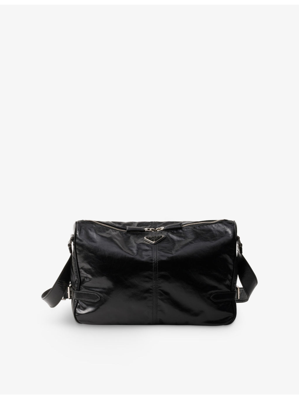 PRODUCT DETAILS - Prada leather shoulder bag - 100% leather - Zip fastening - Adjustable shoulder strap, decorative side straps with buckles, enamelled triangle logo plaque at front, one main compartment, one interior zip pocket, rear zip pocket, logo-print lining - Height 22cm, width 35cm, length 12cm - Specialist leather clean - Please note, we are unable to accept in-store returns on Prada orders Ref: R04422612