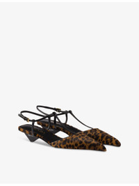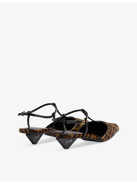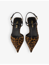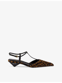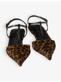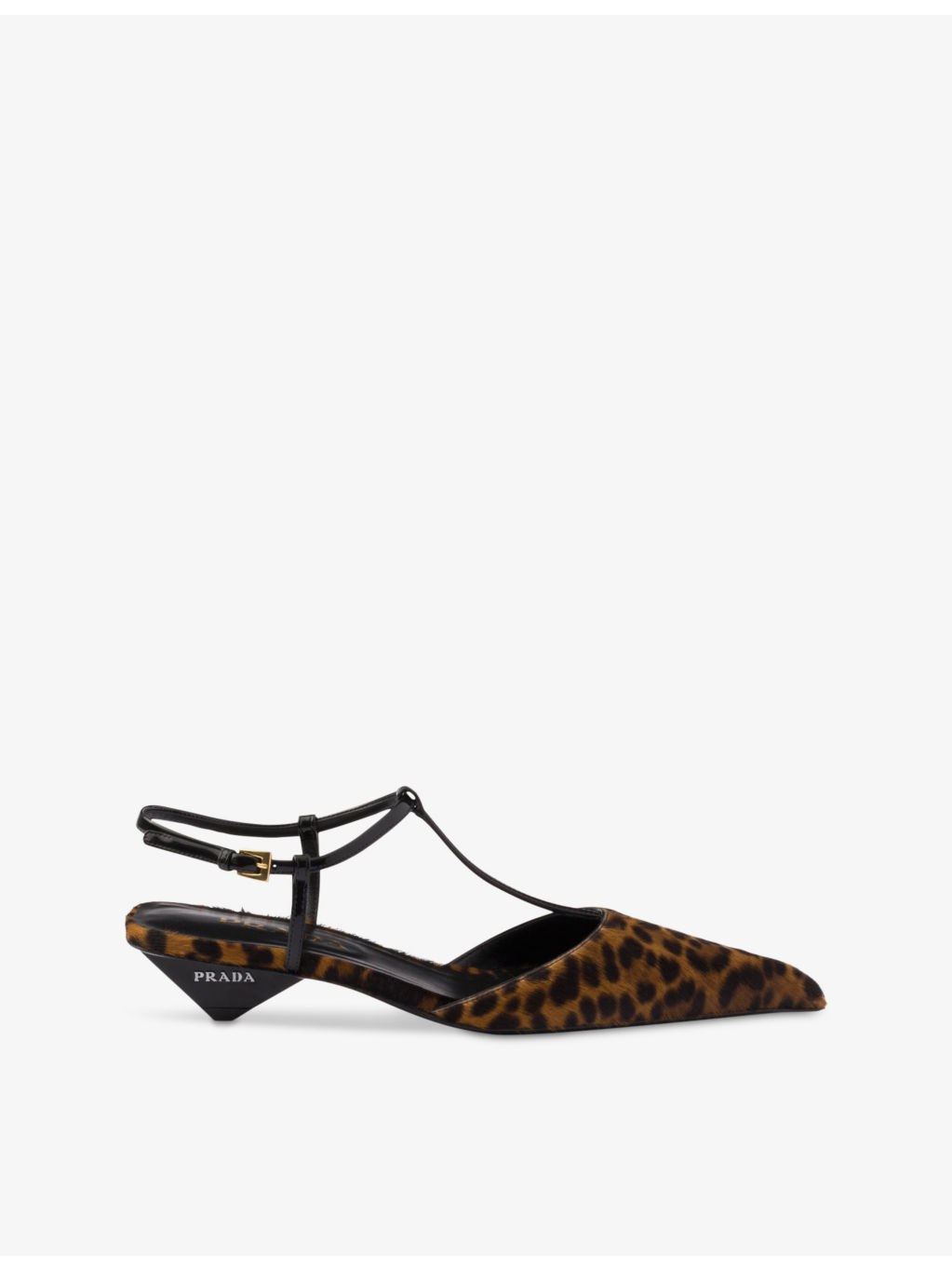 PRODUCT DETAILS - Prada leather heeled courts - 100% leather - Buckle fastening - Closed pointed toe, T-bar straps, triangle branded heel, leopard pattern upper - Heel height 1.3in - Specialist leather clean - Made in Italy - Upper: 100% leather - Lining: 100% leather - Sole: 100% rubber Ref: R04373185