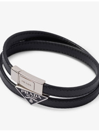 PRODUCT DETAILS - Prada Saffiano leather bracelet - 100% calf leather - Push-lock clasp - Hypoallergenic and nickel-free materials - Tonal stitching, metal triangle logo with enamelled loop, logo-engraved fastening, double loop silhouette - Specialist leather clean - Made in Italy