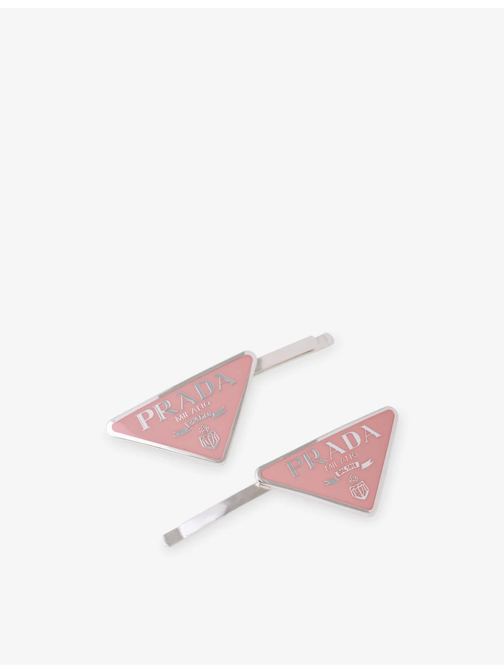 PRODUCT DETAILS - Prada metal hair clips set of two - 100% metal - Sliding closure - Twin pair, enamelled triangle logo, silver-toned hardware - Wipe with a clean, dry cloth Ref: R04268263