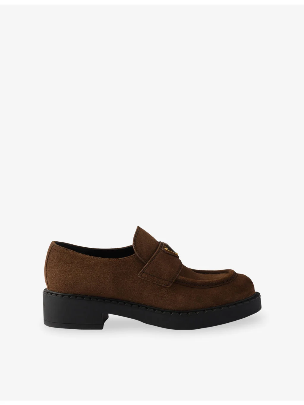 PRODUCT DETAILS - Prada suede loafers - 100% suede - Slips on - Triangle logo plaque at front, brushed texture, chunky sole - Specialist leather clean - Made in Italy - Upper: 100% suede - Lining: 100% leather - Sole: 100% leather - Please note, we are unable to accept in-store returns on Prada orders Ref: R04569111