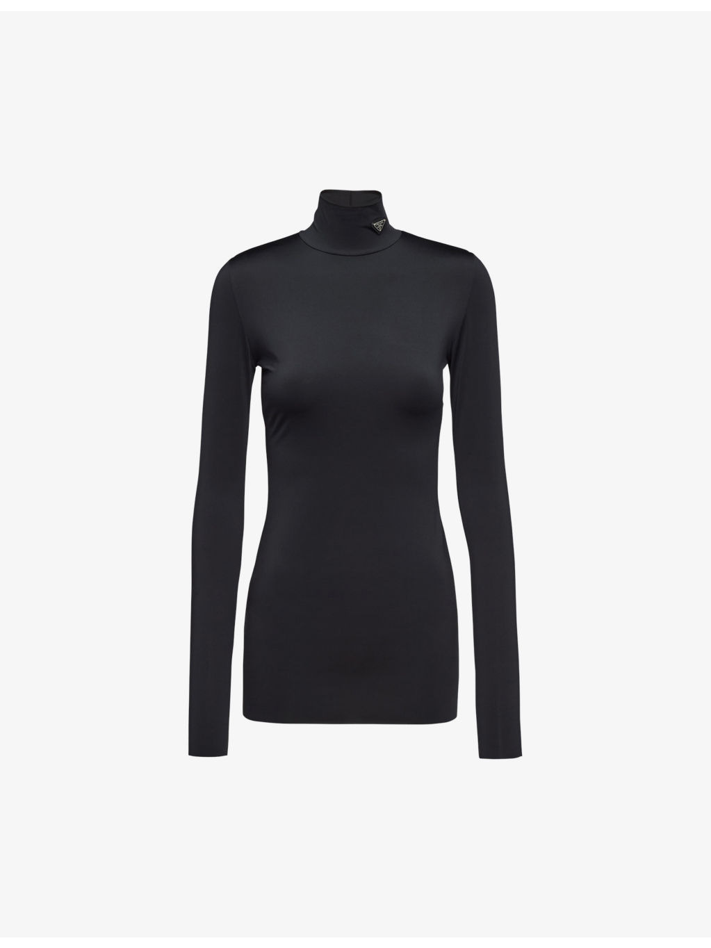 PRODUCT DETAILS - Prada jersey jumper - 100% nylon - Slips on - Slim fit, turtleneck, signature enamelled Triangle brand plaque at neck, long sleeves - Dry clean - Lightweight, slight stretch Ref: R04320154