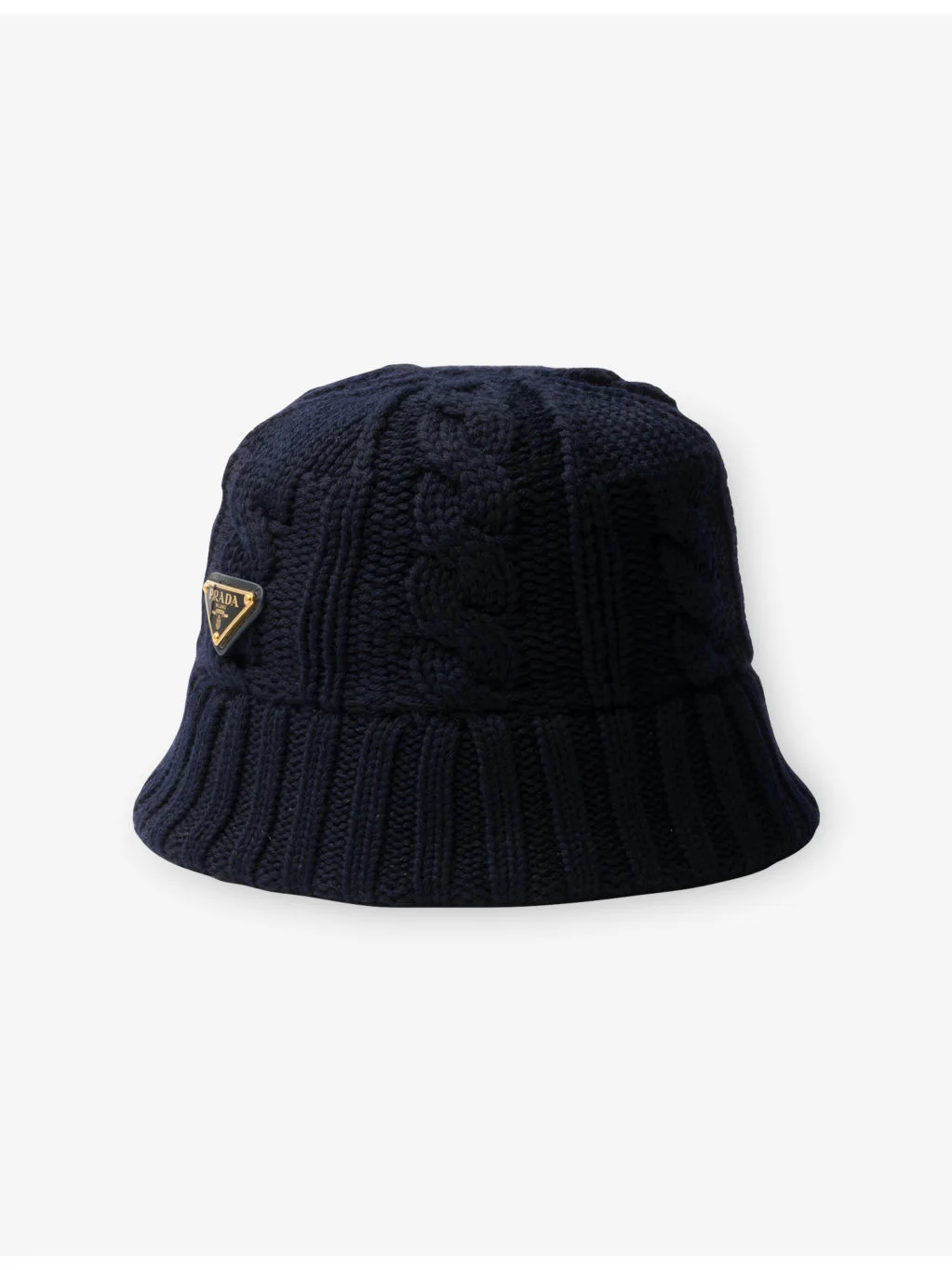 PRODUCT DETAILS - Prada wool bucket hat - 100% wool - Bucket shape, enamelled triangle logo plaque at front, dropped brim, ribbed trim, cable-knit design - Dry clean - Made in Italy Ref: R04569064