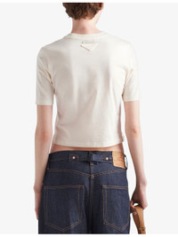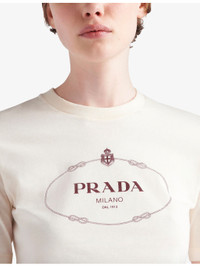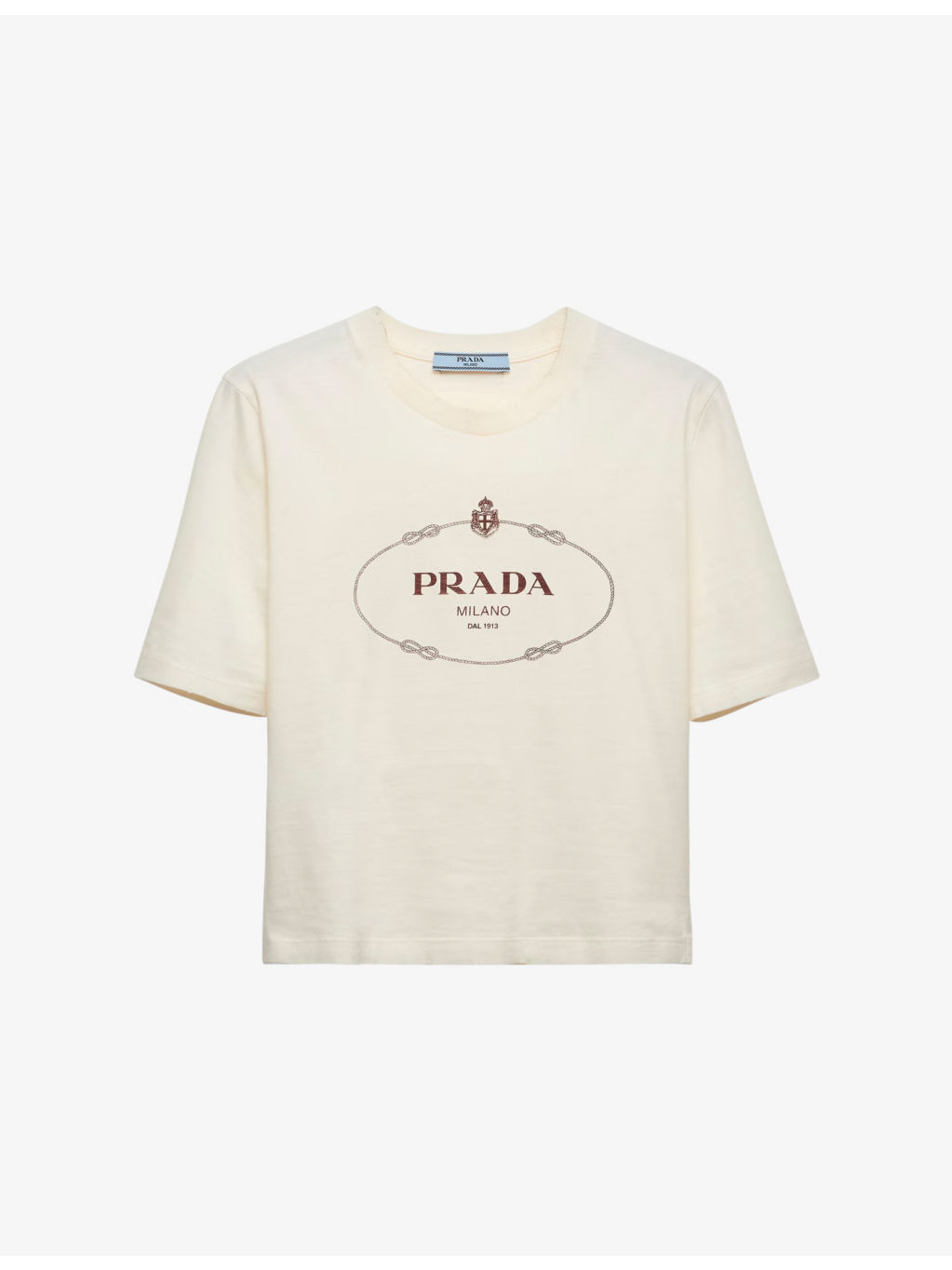 PRODUCT DETAILS - Prada cotton-jersey T-shirt - 100% cotton - Slips on - Boxy fit, crewneck, ribbed neckline, short sleeves, logo print at front, triangle and sartorial logo at front at back neckline - Dry clean - True to size - Model is 5ft 10in/1.78m and wears a size UK 8 - Lightweight, non-stretch Ref: R04328955